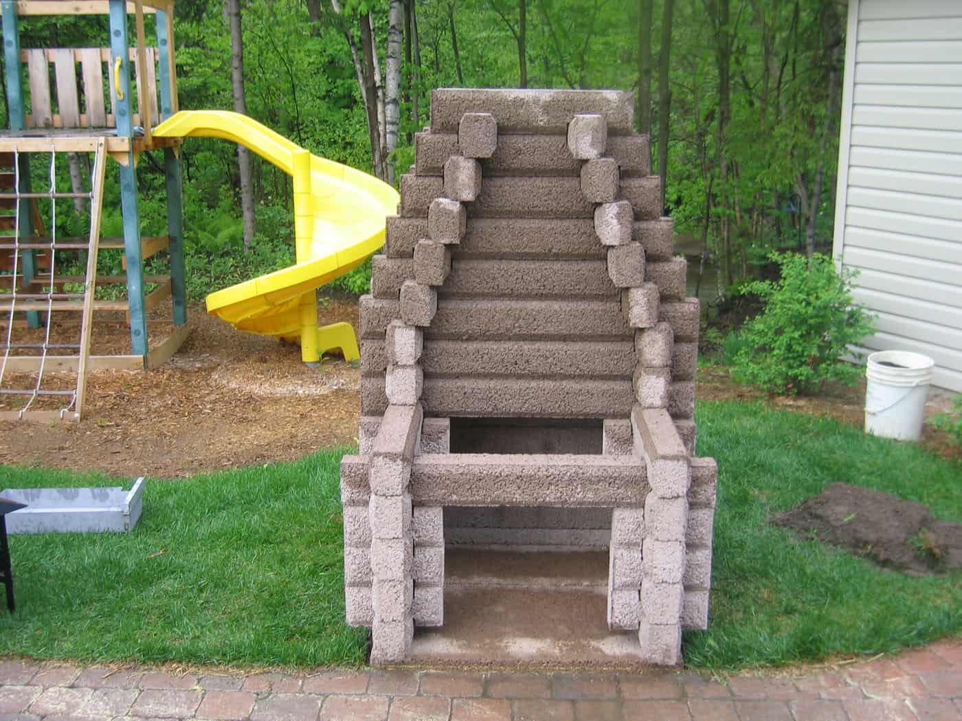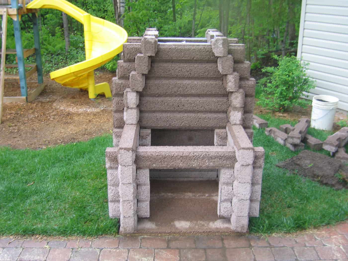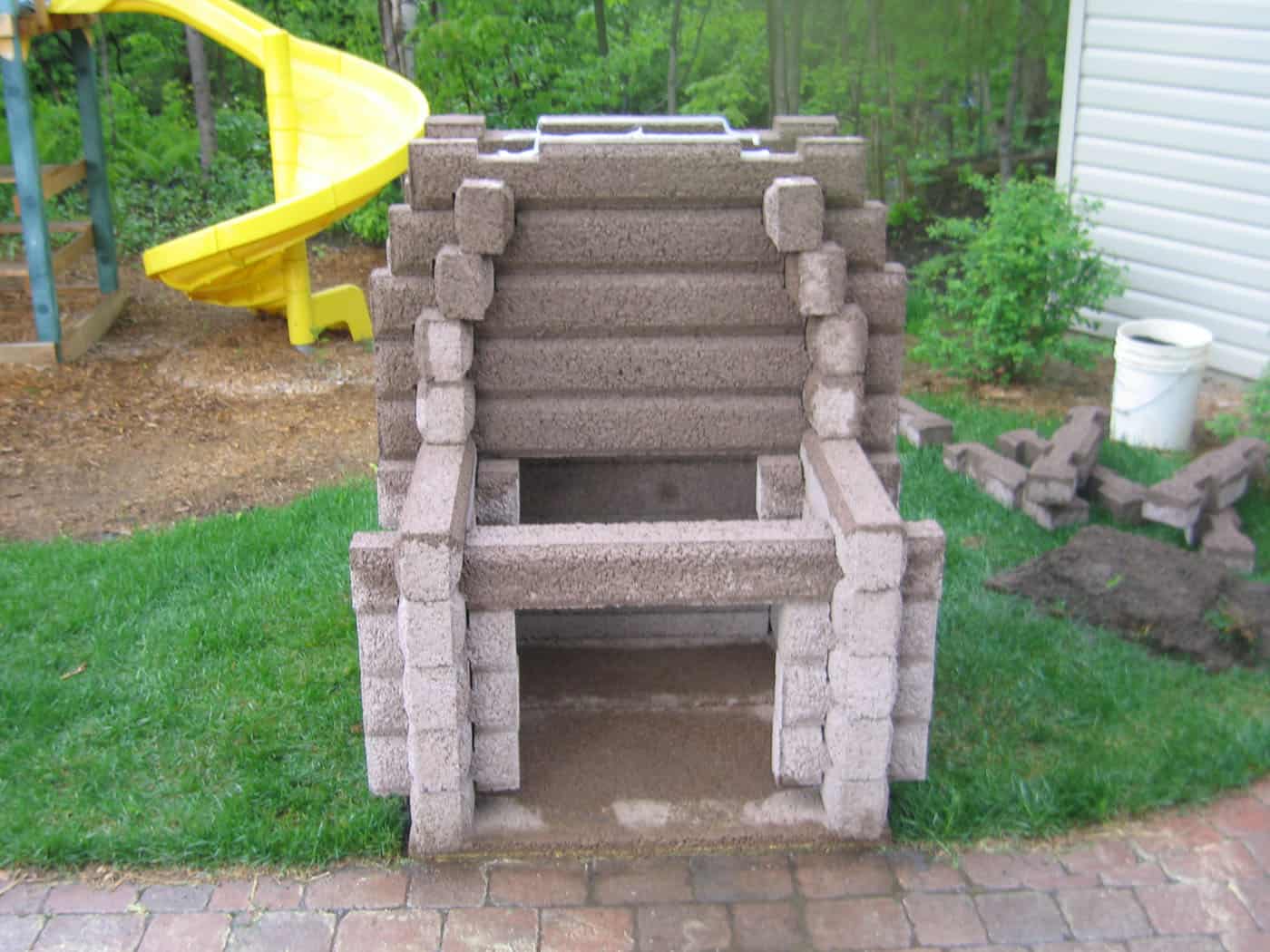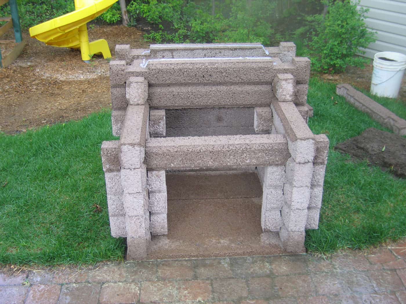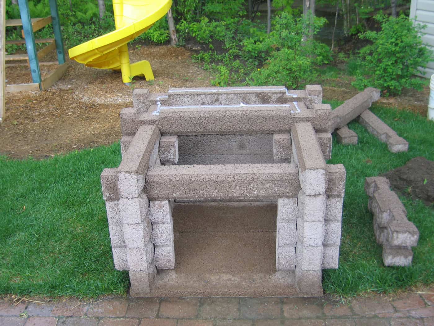 Placez 2 blocs de 42″ (4 coches en ligne). Comme la cheminée décroîtra, appliquez le silicone vers l’intérieur de la cheminée. Ainsi il ne sera pas visible de l’extérieur lorsque vous apposerez les prochaines pierres. Dès cette étape, vous pouvez installer vos coulisses et essayer votre plaque. Vous constaterez si vous êtes à l’équerre. Il est encore temps de bouger un peu votre nouveau foyer extérieur!