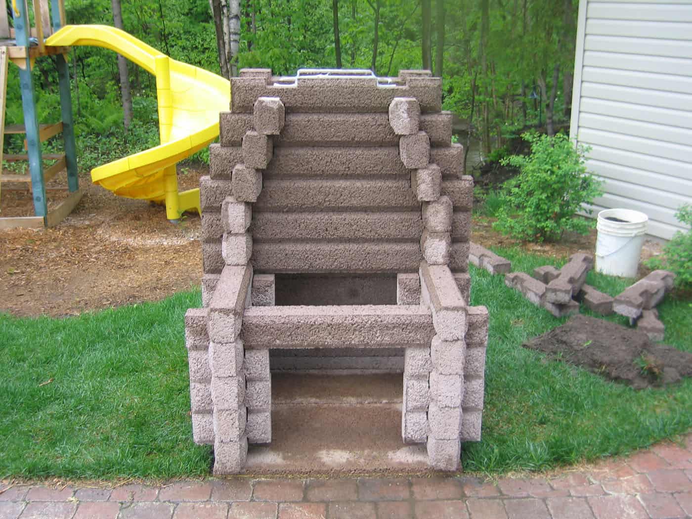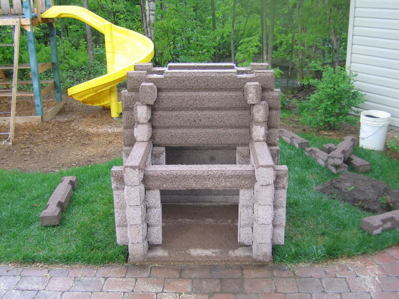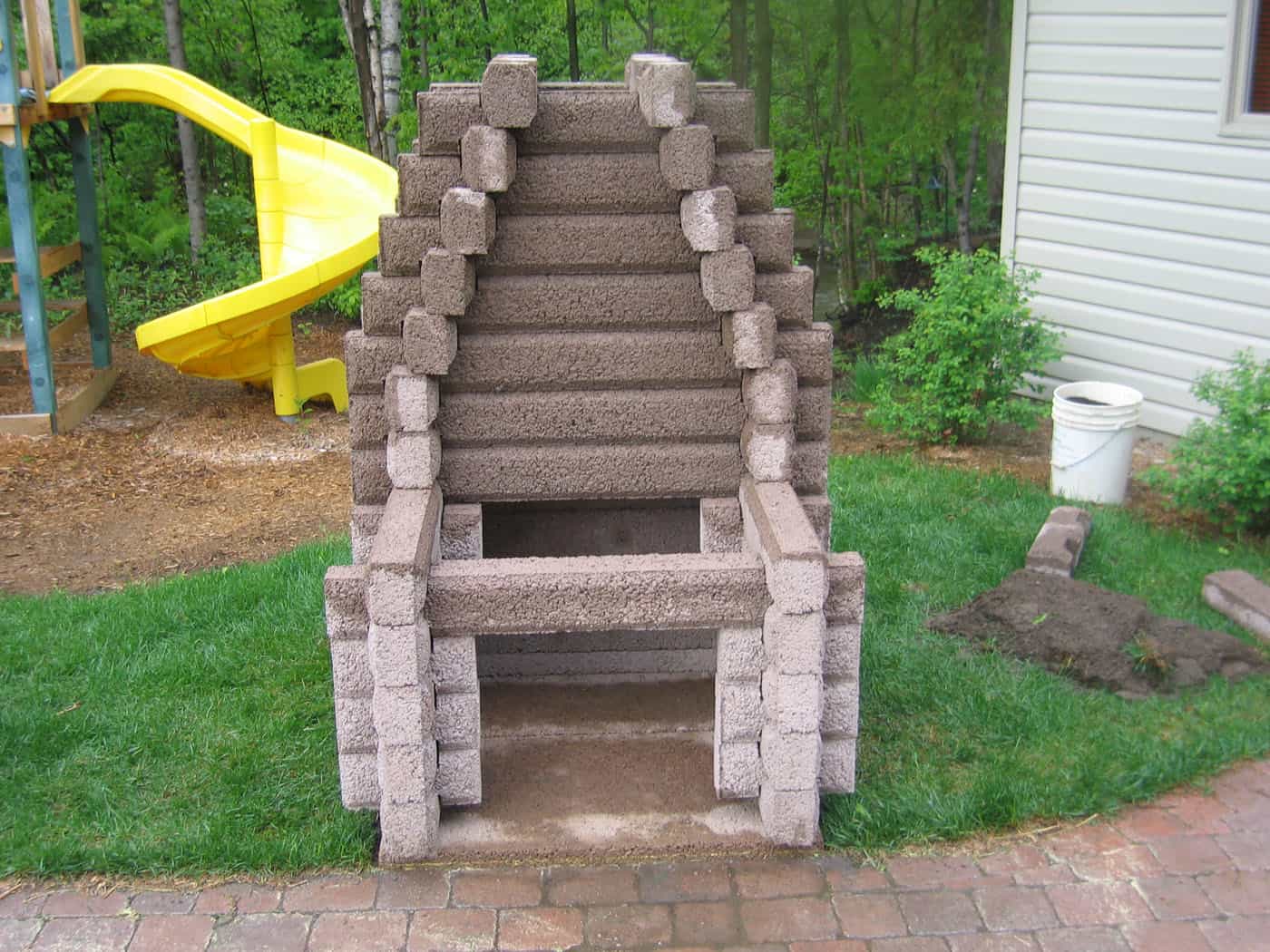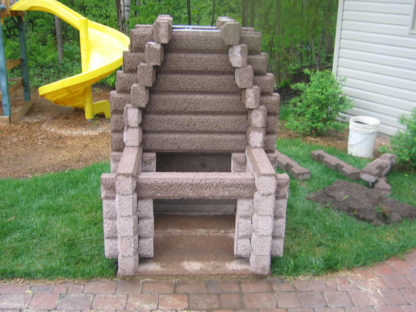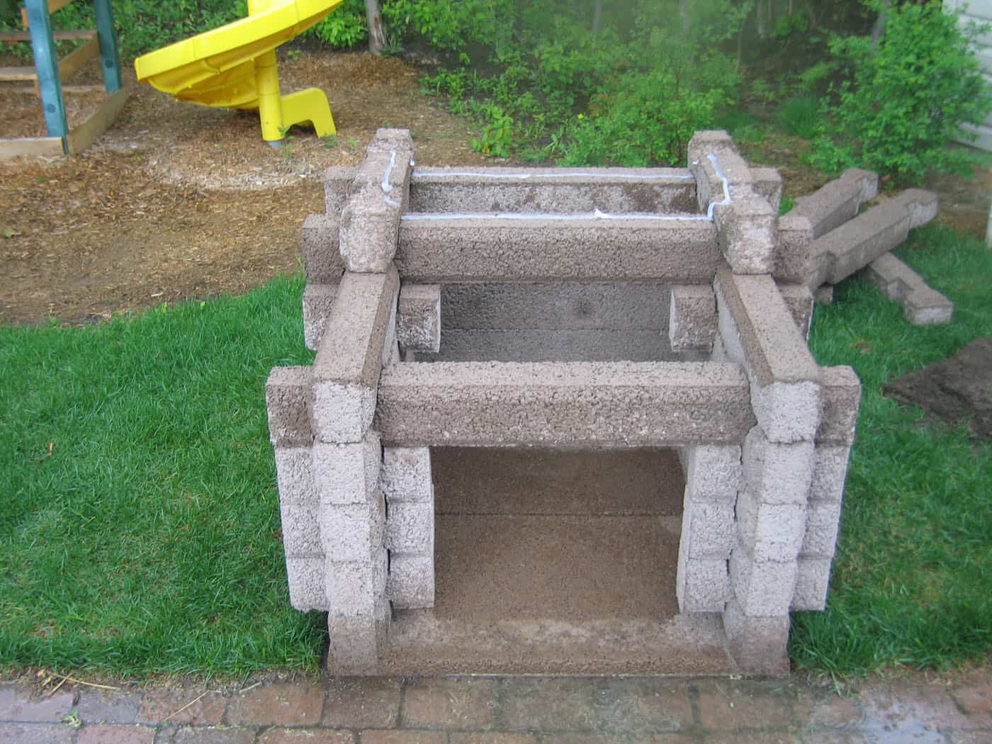 Placez 2 blocs de 42″ (4 coches en ligne). Comme la cheminée décroîtra, appliquez le silicone vers l’intérieur de la cheminée. Ainsi il ne sera pas visible de l’extérieur lorsque vous apposerez les prochaines pierres. Dès cette étape, vous pouvez installer vos coulisses et essayer votre plaque. Vous constaterez si vous êtes à l’équerre. Il est encore temps de bouger un peu votre nouveau foyer extérieur!