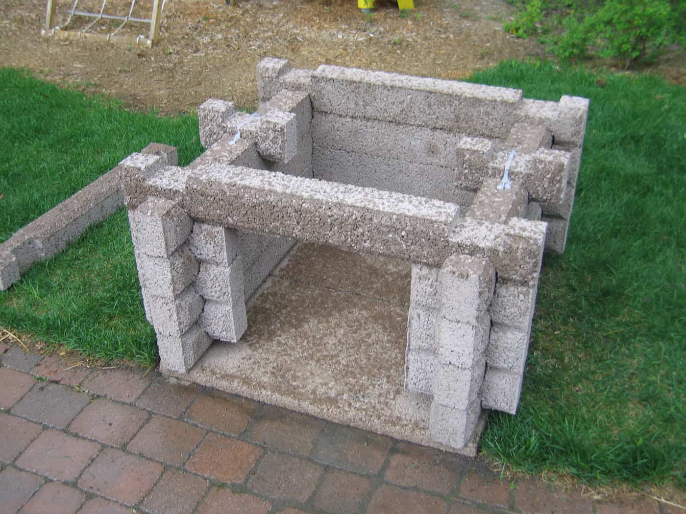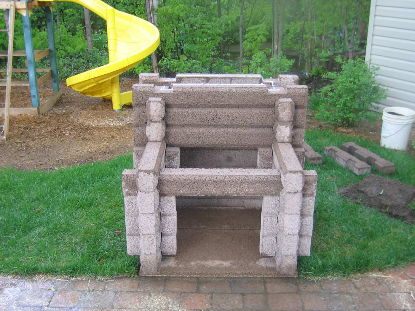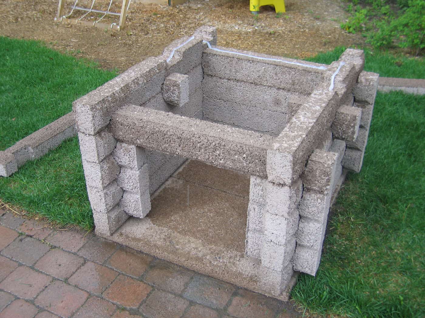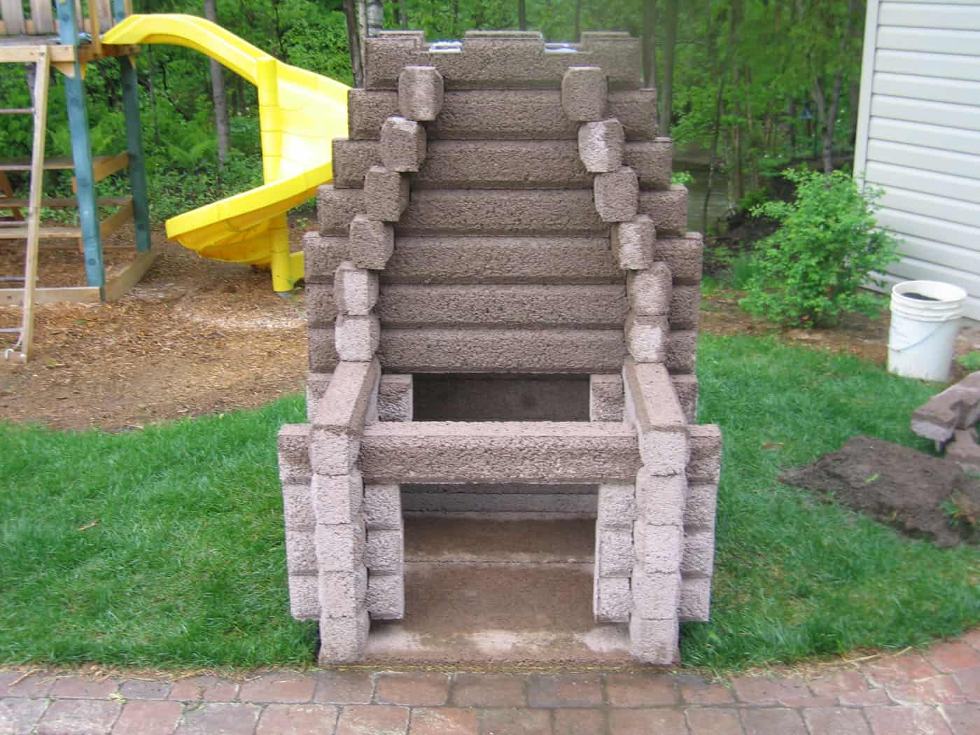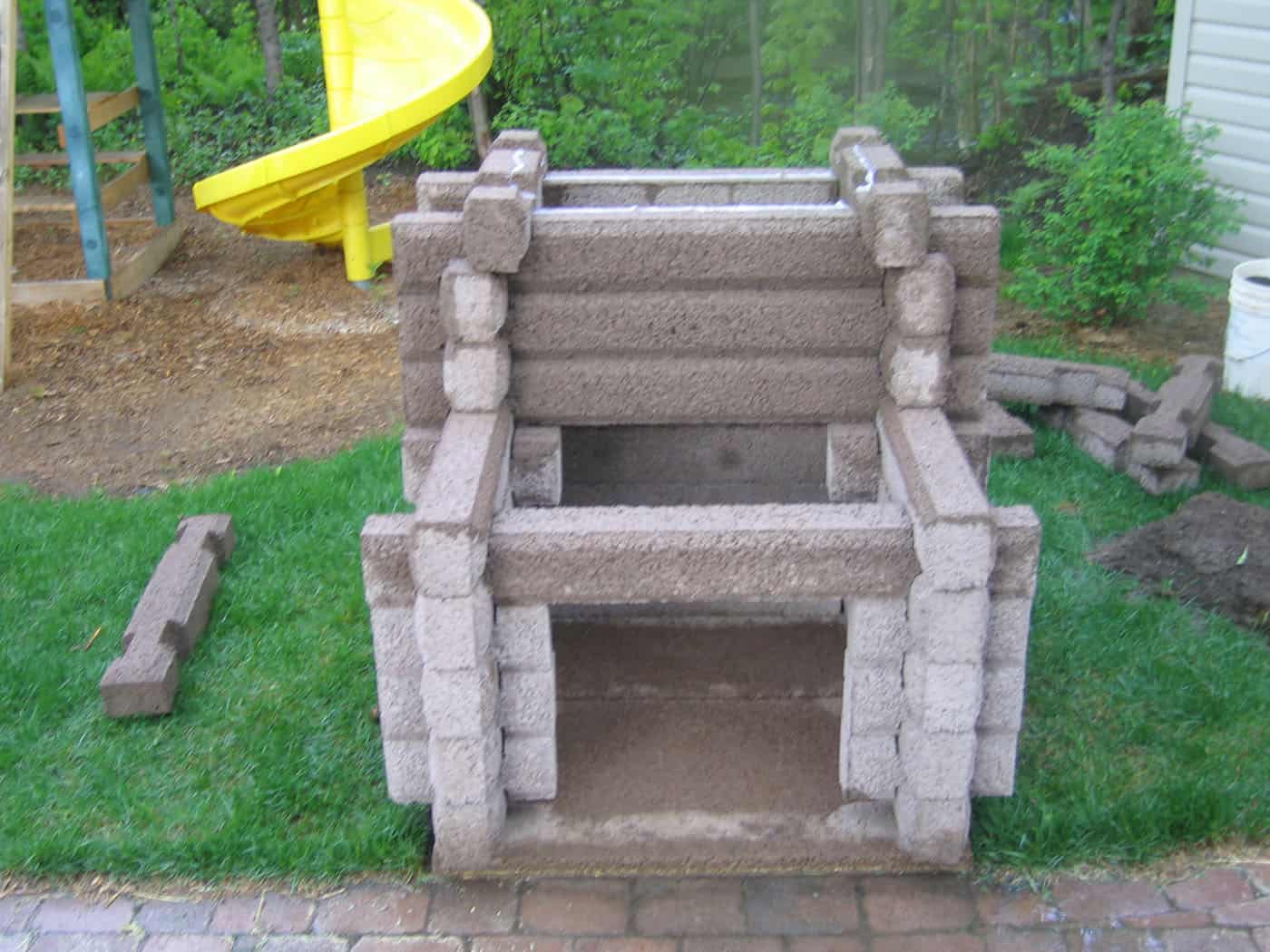 Placez 2 blocs de 42″ (4 coches en ligne). Comme la cheminée décroîtra, appliquez le silicone vers l’intérieur de la cheminée. Ainsi il ne sera pas visible de l’extérieur lorsque vous apposerez les prochaines pierres. Dès cette étape, vous pouvez installer vos coulisses et essayer votre plaque. Vous constaterez si vous êtes à l’équerre. Il est encore temps de bouger un peu votre nouveau foyer extérieur!