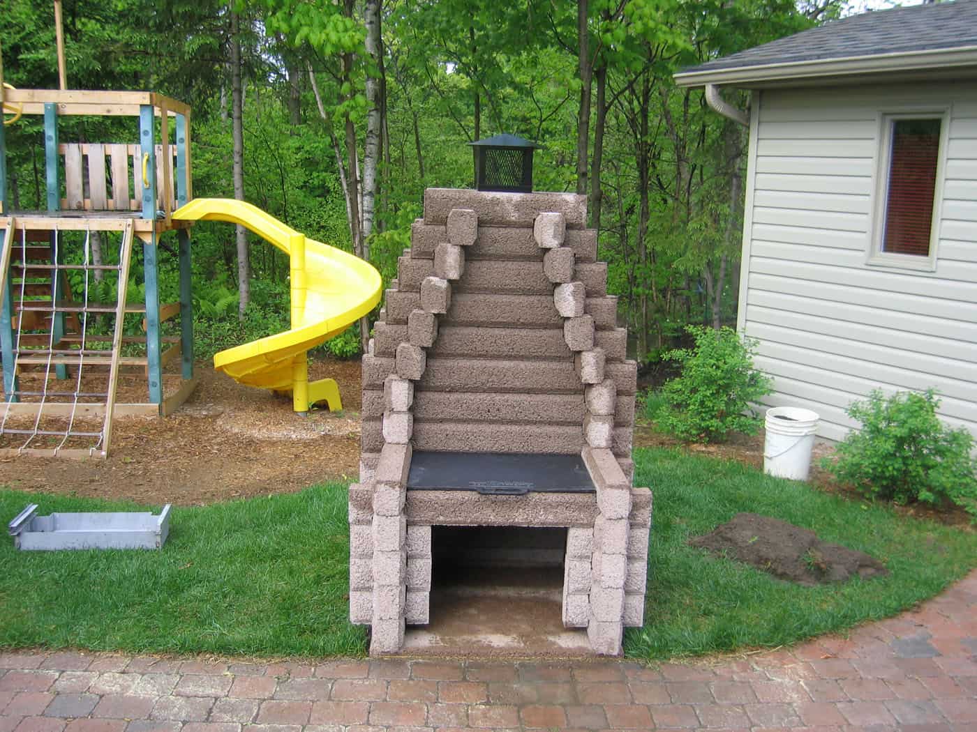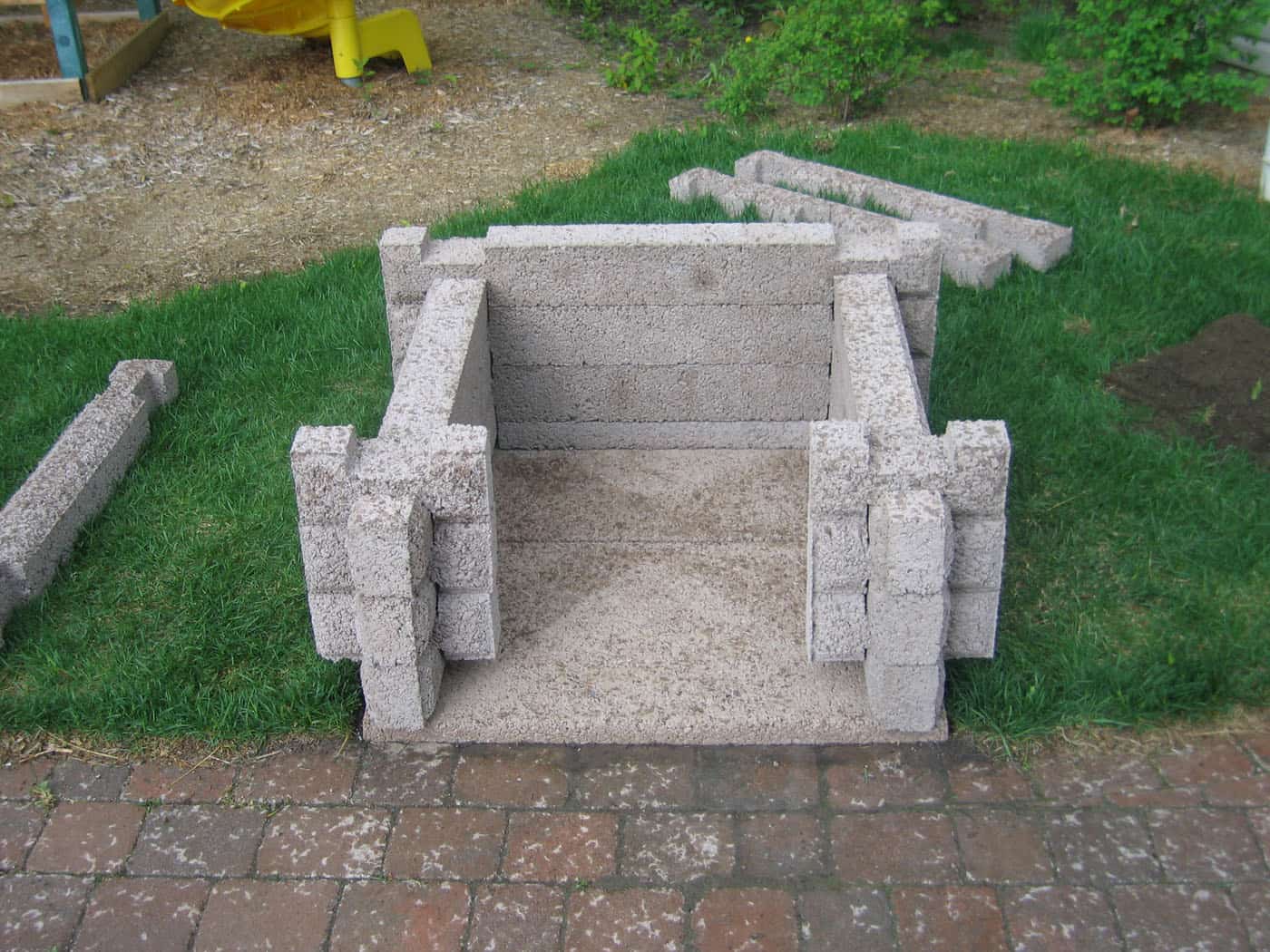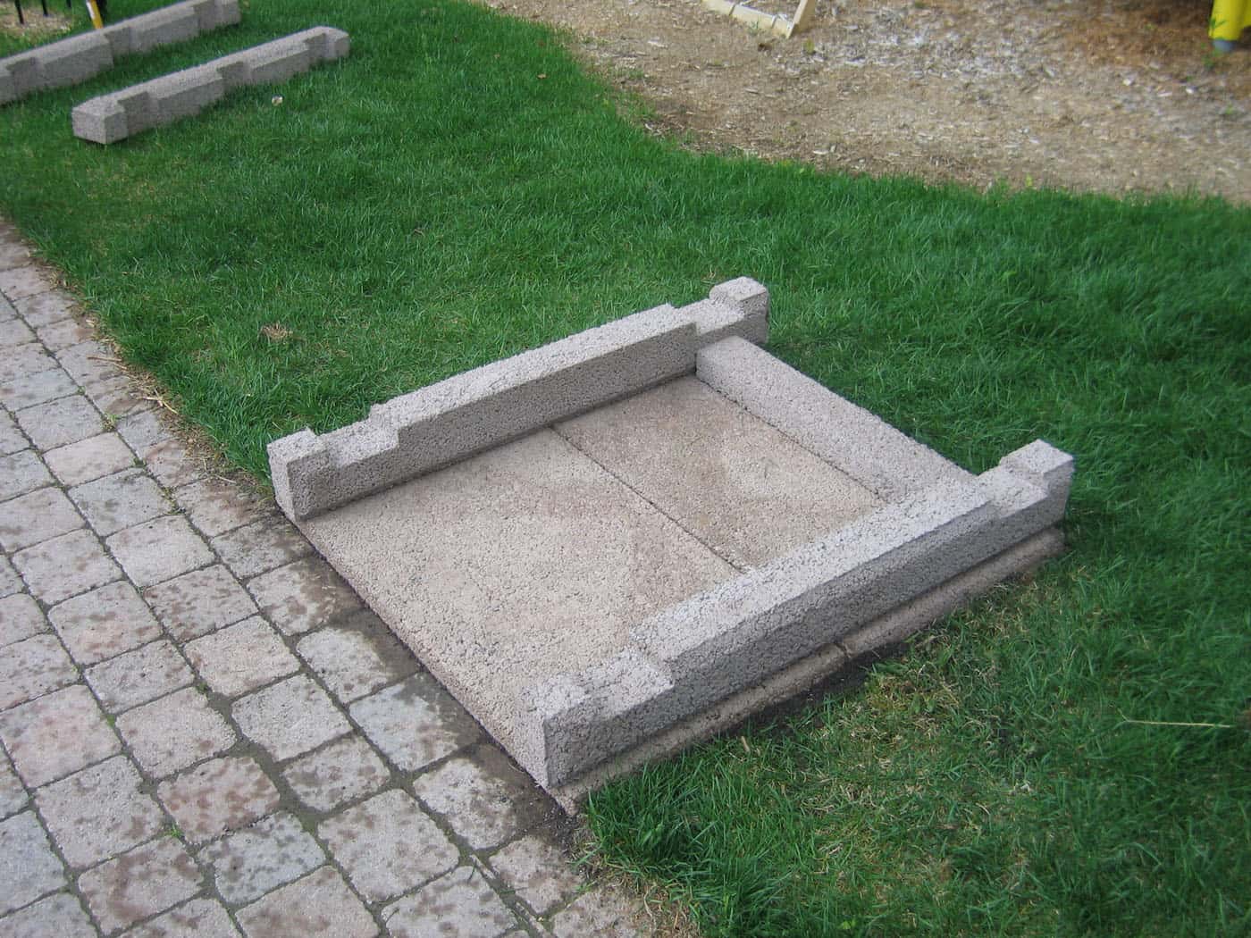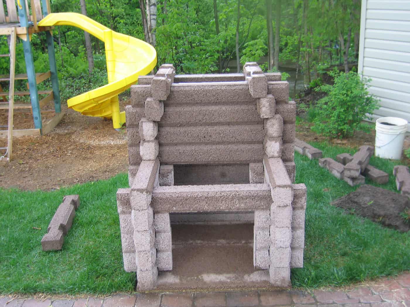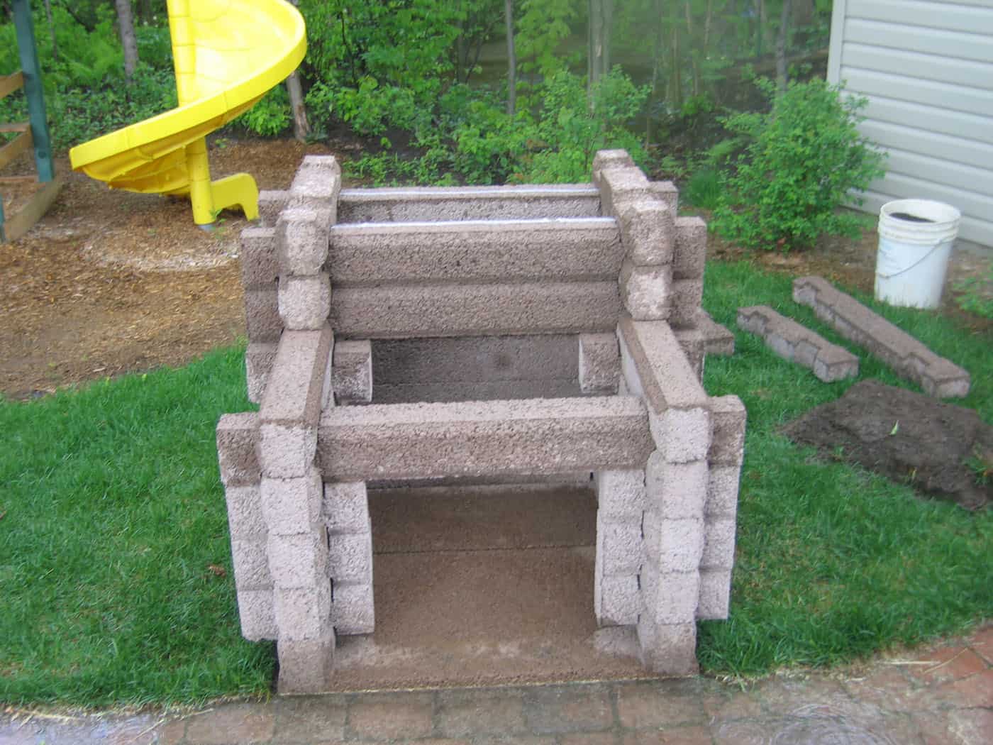 Placez 2 blocs de 42″ (4 coches en ligne). Comme la cheminée décroîtra, appliquez le silicone vers l’intérieur de la cheminée. Ainsi il ne sera pas visible de l’extérieur lorsque vous apposerez les prochaines pierres. Dès cette étape, vous pouvez installer vos coulisses et essayer votre plaque. Vous constaterez si vous êtes à l’équerre. Il est encore temps de bouger un peu votre nouveau foyer extérieur!